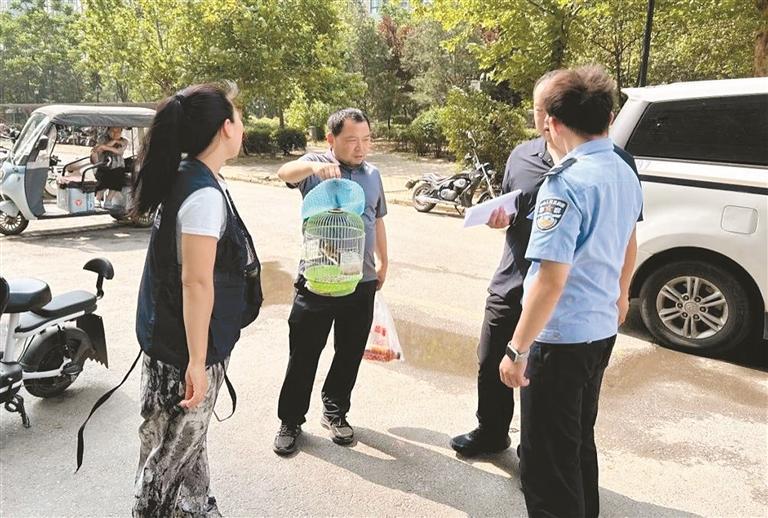 镐京大道派出所民警和网格员悉心照料金翅雀,并向专业机构移交。(西咸公安供图)